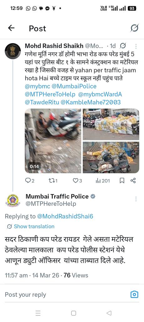 गणेश मूर्ति नगर डॉ होमी भाभा रोड कफ परेड मुंबई 5 यहां पर पुलिस बीट १ के सामने कंस्ट्रक्शन का मटेरियल रखा है जिसकी वजह से yahan per traffic jaam hota Hai बच्चे टाइम पर स्कूल नहीं पहुंच पाते @mybmc @MumbaiPolice @MTPHereToHelp @mybmcWardA @TawdeRitu @KambleMahe72003