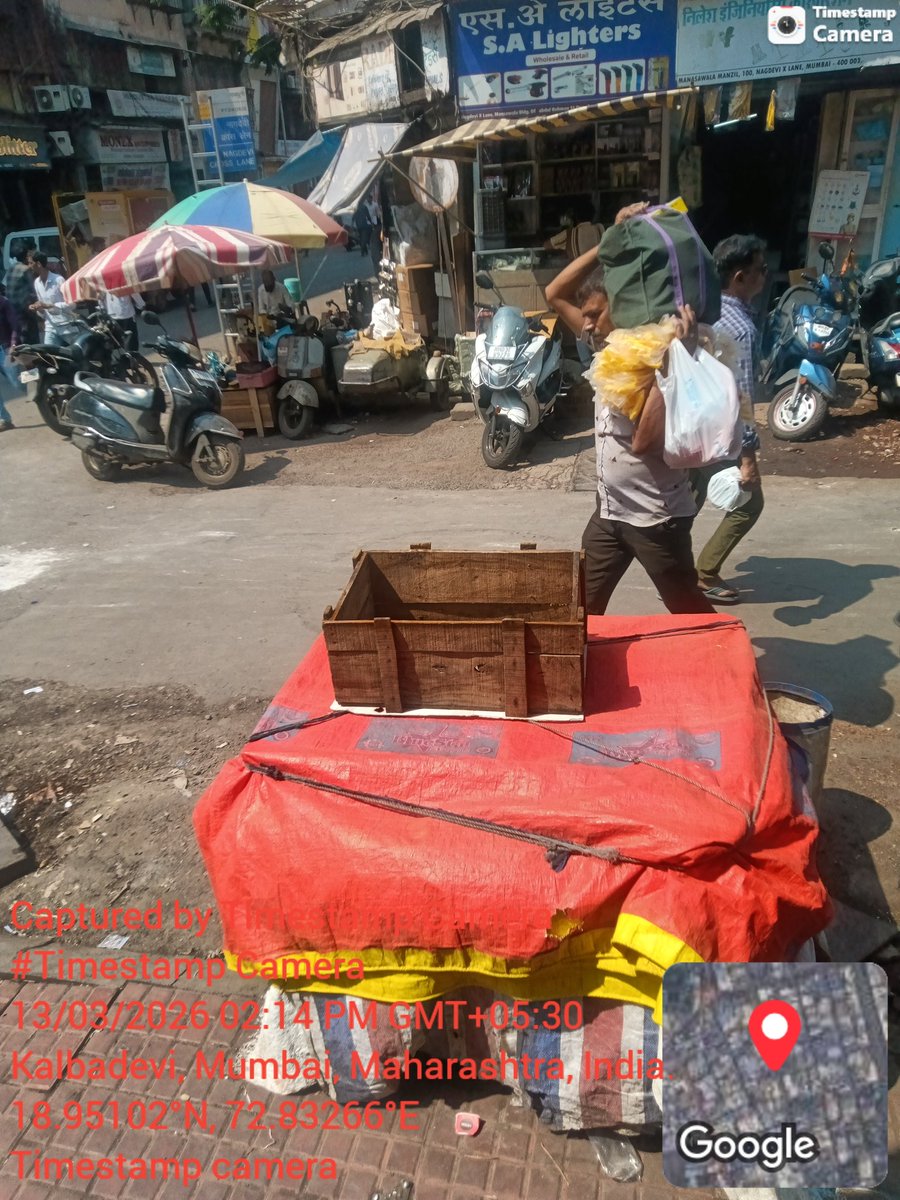 95 Tayeb Manzil, Nagdevi Cross Lane, Abdur Rehman St, Mumbai 400003 footpath par wada pav aur chai ke stalls,gas cylinder ke saath close hone ke baad yahi park hai. Plz clear it as soon as possible before kisiki jaan ka nuksaan ho jaye @mybmcWardB encroachment removal dept b ward