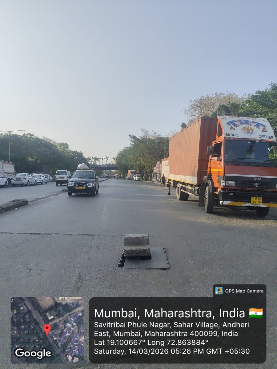 “सहार रोड पर गटर का ढक्कन टूटा हुआ है, जिसके कारण बड़ी दुर्घटना होने की संभावना है। कृपया इस विषय पर तत्काल संज्ञान लिया जाए।” @mybmcWardKE @mybmc @MMRDAOfficial
