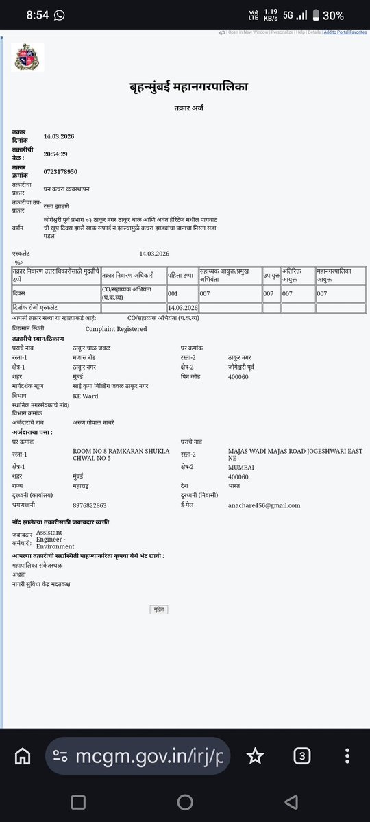 @mybmc @mybmcWardKE जोगेश्वरी पूर्व प्रभाग ७३ ठाकूर नगर ठाकूर चाळ आणि अवंत हेरिटेज मधील पायवाट ची खूप दिवस झाले साफ सफाई न झाल्यामुळे कचरा झाड्यांचा पानाचा निस्ता सडा पडला आहे.ठिकाणी साफसफाई करण्यात यावी. सीएम क्लीन मुंबई हेल्पलाईन वर तक्रार करण्यात आली आहे तक्रार नंबर 0723178149