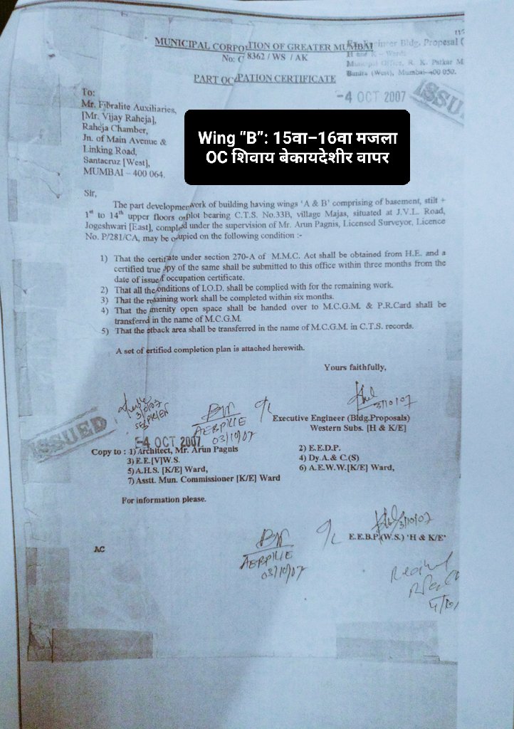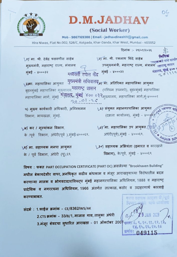 🚨 FIRST REMINDER | PART OC VIOLATION | IMMEDIATE ACTION REQUIRED 🚨 माननीय आयुक्त @mybmc | @mybmcWardKN📍 Brookhaven Building, CTS No. 33/B/1, Majas Village, Jogeshwari–Vikhroli Link Road, Jogeshwari (E), Mumbai. 🔎 File No.: CE/8362/WS/AK 📑 Last Approved Revised Plan: 01/10/2007 📝 Original Complaint: 29/01/2026 📩 Reminder-1: 05/02/2026 सदर इमारत फक्त PART OC वर असूनही — ❗ Wing “B” मधील 15 वा व 16 वा मजला कोणत्याही वैध OC शिवाय वापरात ❗ मोठ्या प्रमाणावर अनधिकृत वाढीव बांधकाम व महसूल गळती ❗ मंजूर आराखड्याच्या विरोधातील बदल सदर इमारत पूर्वी के पूर्व वार्ड (73) मध्ये येत होती. सध्या प्रशासकीय पुनर्रचनेनंतर ती के नॉर्थ वार्ड अंतर्गत येत असून, संबंधित सहाय्यक आयुक्त श्री. महेश पाटील यांनी या प्रकरणाची तात्काळ दखल घ्यावी. आजपर्यंत कोणतीही ठोस कारवाई किंवा अधिकृत लेखी उत्तर प्राप्त झालेले नाही. हे उल्लंघन MMC Act 1888 (Sec 351, 354, 488, 152A) व MRTP Act 1966 (Sec 53, 54) अंतर्गत दखलपात्र आहे. संयुक्त पाहणी करून वापर त्वरित थांबवावा व कठोर कारवाई करावी. सार्वजनिक सुरक्षिततेचा गंभीर विषय — दिरंगाई अस्वीकार्य. भविष्यातील कोणत्याही दुर्घटनेस प्रशासन जबाबदार राहील. @RavindraWaikar @mieknathshinde @CMOMaharashtra @CPMumbaiPolice @ACB_Maharashtra @MAHA_UDD @MumbaiPolice #BrookhavenBuilding #IllegalConstruction #PartOCViolation #BMCActionNow #JogeshwariEast #ZeroTolerance #PublicSafety