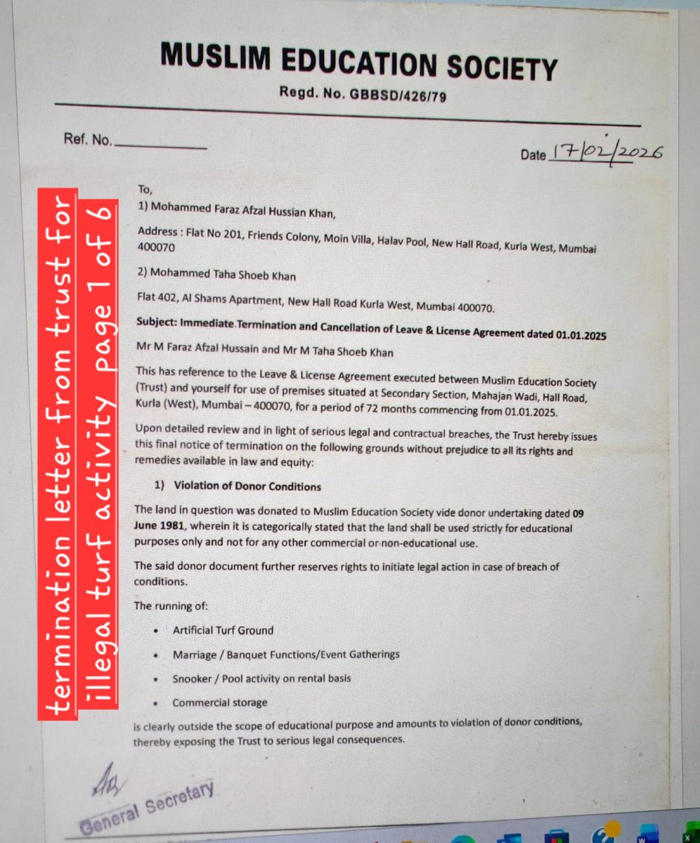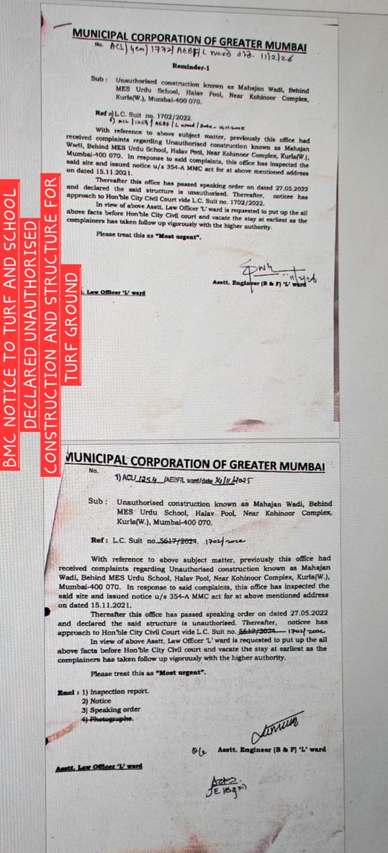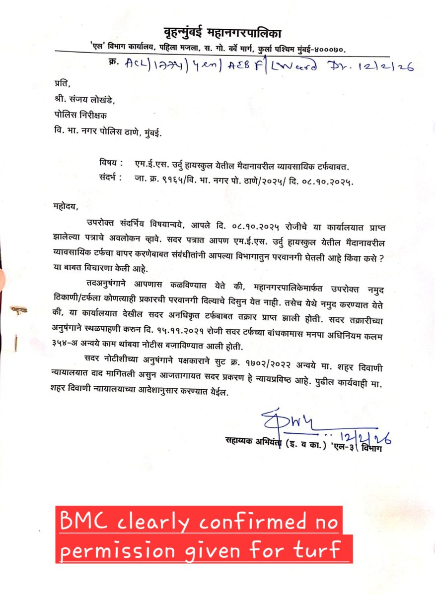 @MumbaiPolice @CPMumbaiPolice @mybmc @mybmcWardL @MumbaiPolice @mybmc @mybmcWardL Evidence attached 👇 * BMC has confirmed no permission for turf / related commercial activity * BMC has already declared the structure unauthorized * The Trust has officially cancelled the agreement Despite this, activities continue daily and late into the night causing nuisance to nearby residents. A pending suit against demolition does not permit illegal commercial activity creating nuisance. Request urgent intervention from @MumbaiPolice @mybmc @mybmcWardL