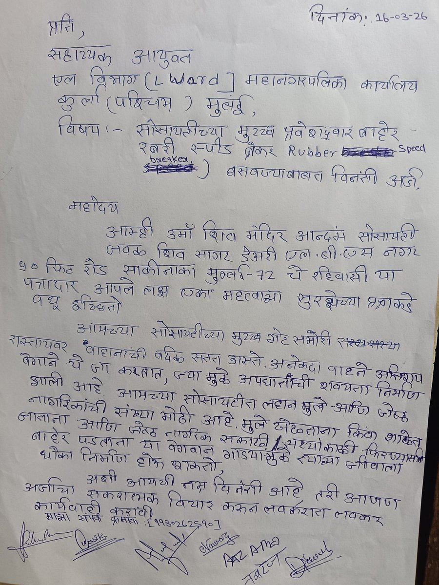हमारी सोसायटी मे अर्जेंट रब्बर स्पीड ब्रेकर की जरूरत है छोटे बच्चों और सिनियर सिटीज़न की सेफ्टी के लिए . लोकेशन : उमा शिव मंदिर नियर शिव सागर डेयरी एलबीएस नगर 90 फिट रोड साकीनाका मुंबई 72. @mybmc @mybmcWardL @MTPHereToHelp