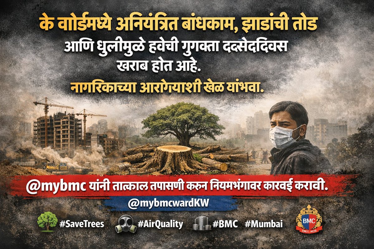 “के वॉर्डमध्ये अनियंत्रित बांधकाम, झाडांची तोड आणि धुळीमुळे हवेची गुणवत्ता दिवसेंदिवस खराब होत आहे. नागरिकांच्या आरोग्याशी खेळ थांबवा. @mybmc यांनी तात्काळ तपासणी करून नियमभंगावर कारवाई करावी. @mybmcwardKW @TawdeRitu #SaveTrees #AirQuality #BMC #mumbai @CMOMaharashtra